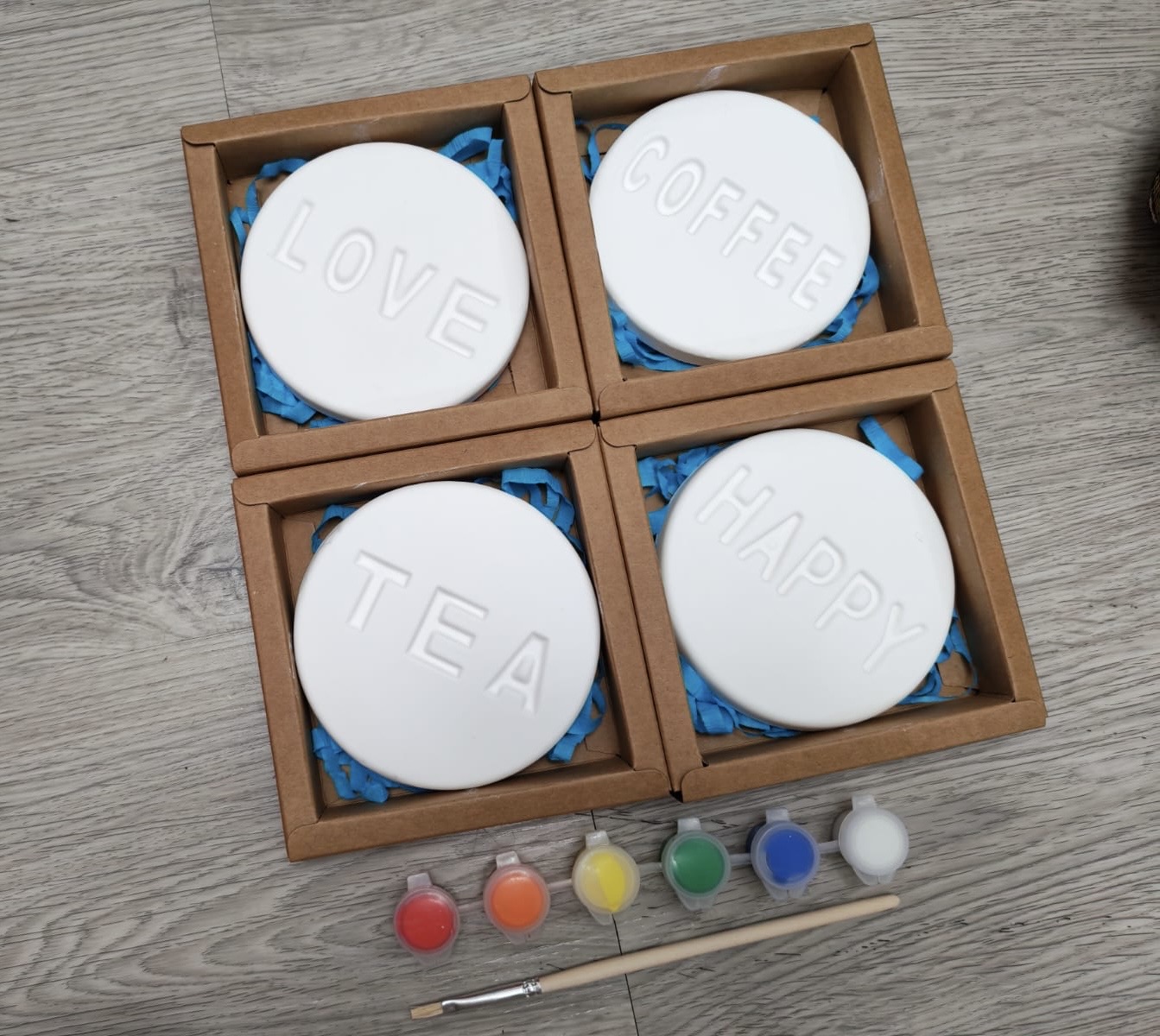 句括石膏杯墊1個,6色顏料,畫筆,禮物盒